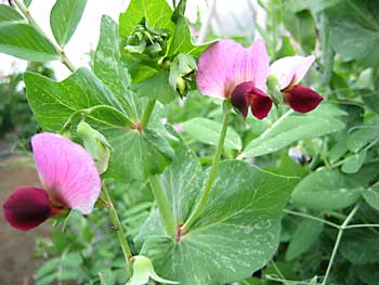 家庭菜園のハウス内では、紫色の花の咲いた野菜が育っています。 野菜の花も意外に美しいものです。花が咲いた後には実ができて、実の中の種を植えることによって、新たな芽が再び出てくるのです。