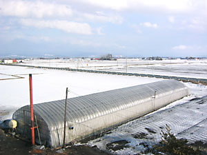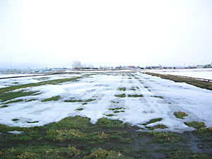 融雪剤が散布されている畑の下には秋蒔き小麦が眠ってい ます。 いつまでも雪の下にいると